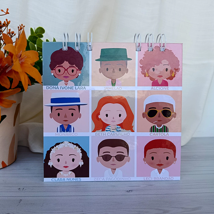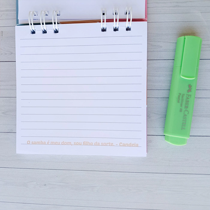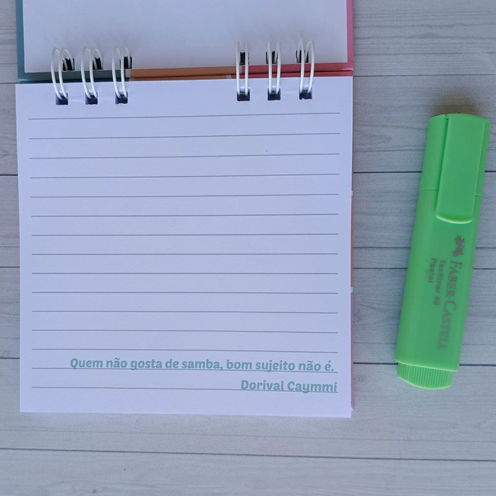 Cada página apresenta uma frase ou trecho de sambas icônicos, trazendo boas lembranças e incentivando a leveza no dia a dia. Produzido com papel offset 90g, linhas suaves e encadernação wire-o branco, o Bloco Sambistas une beleza, praticidade e inspiração para os amantes da música e da escrita.